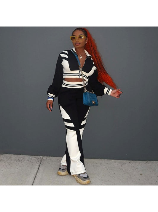 Colorblock Cropped Zipper Coats Pant Sets